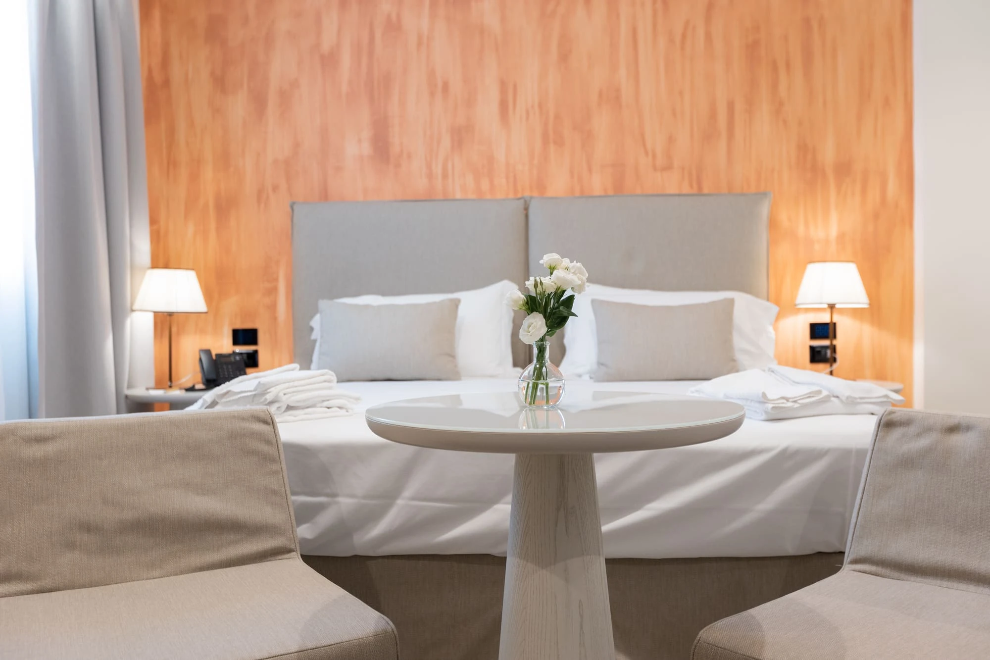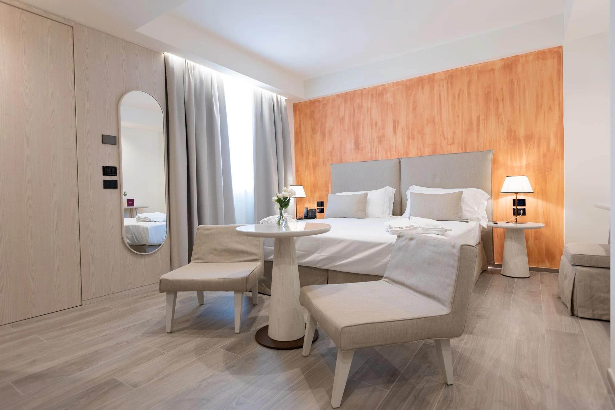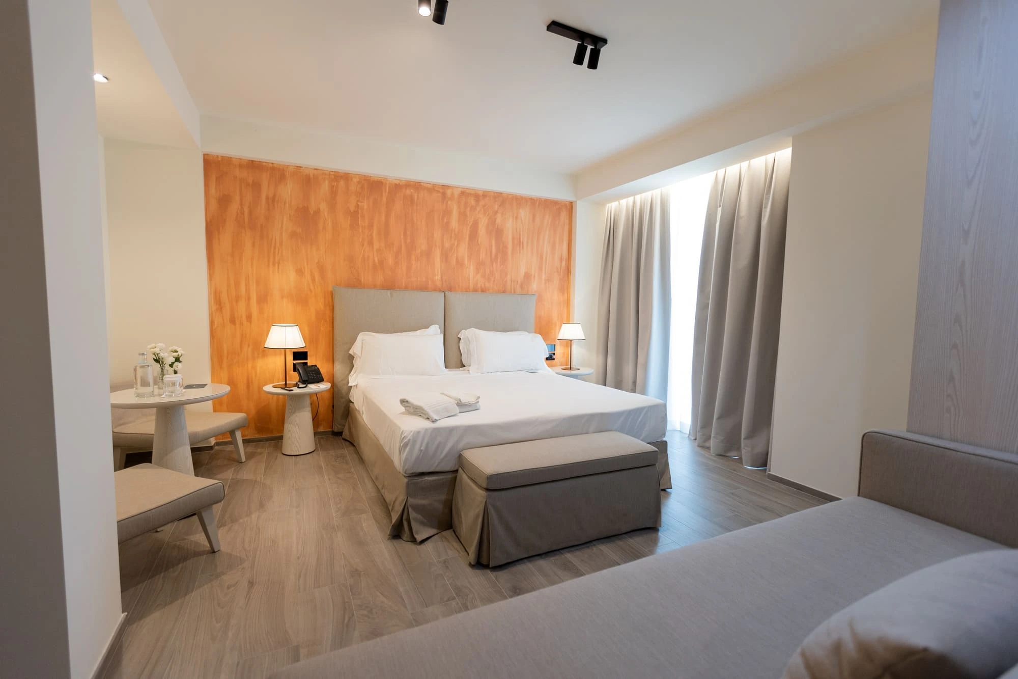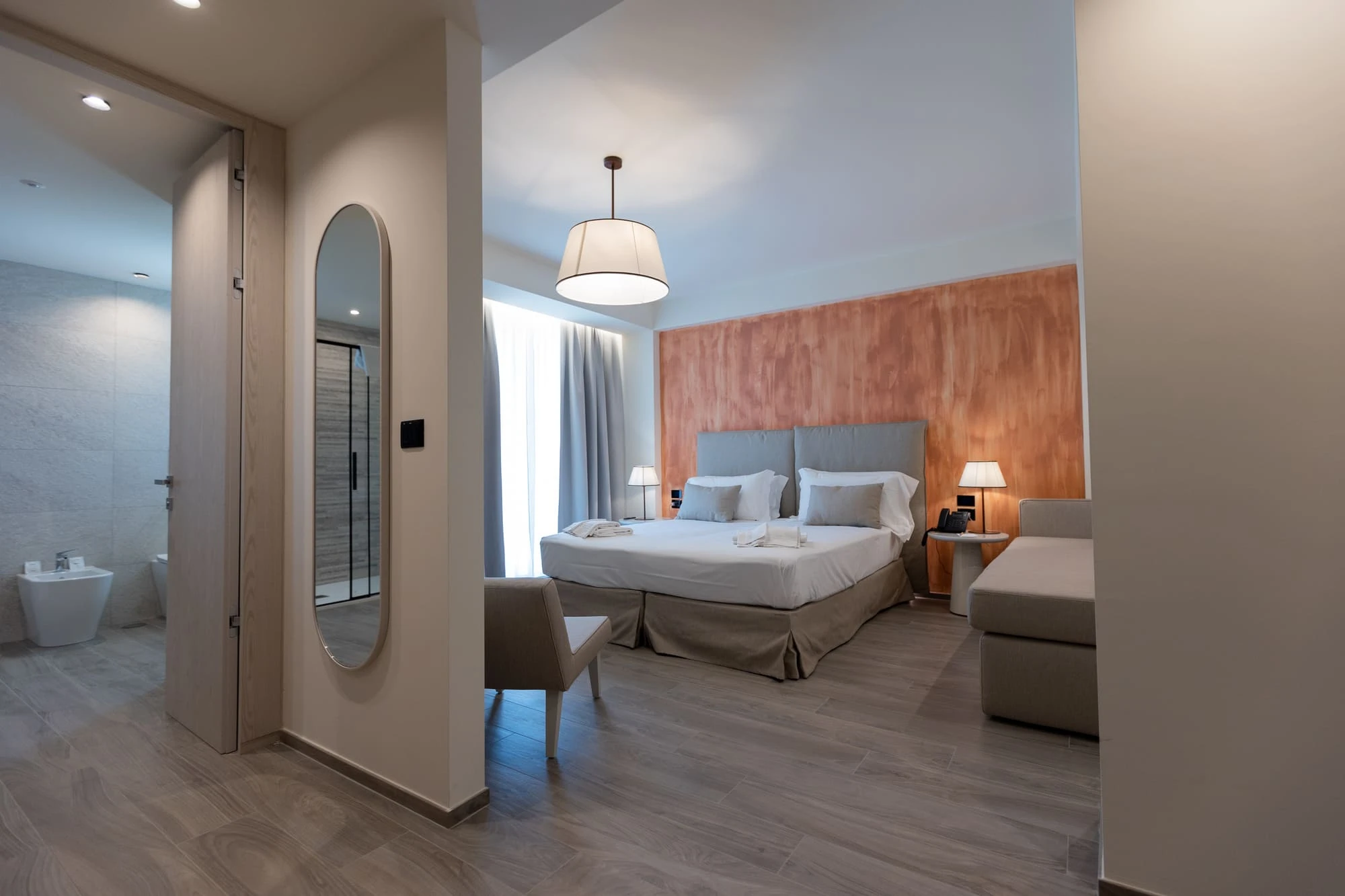 La struttura dispone di tre tipologie di camere: Junior Suite, Suite e SPA Suite, tutte progettate per offrire il massimo comfort. Ogni camera è dotata di letto matrimoniale, bagno privato, aria condizionata e riscaldamento, TV, Wi-Fi, mini frigo bar e cassaforte. La SPA Suite, in particolare, regala un’esperienza esclusiva grazie alla presenza di una vasca idromassaggio in camera e di una sauna a infrarossi.