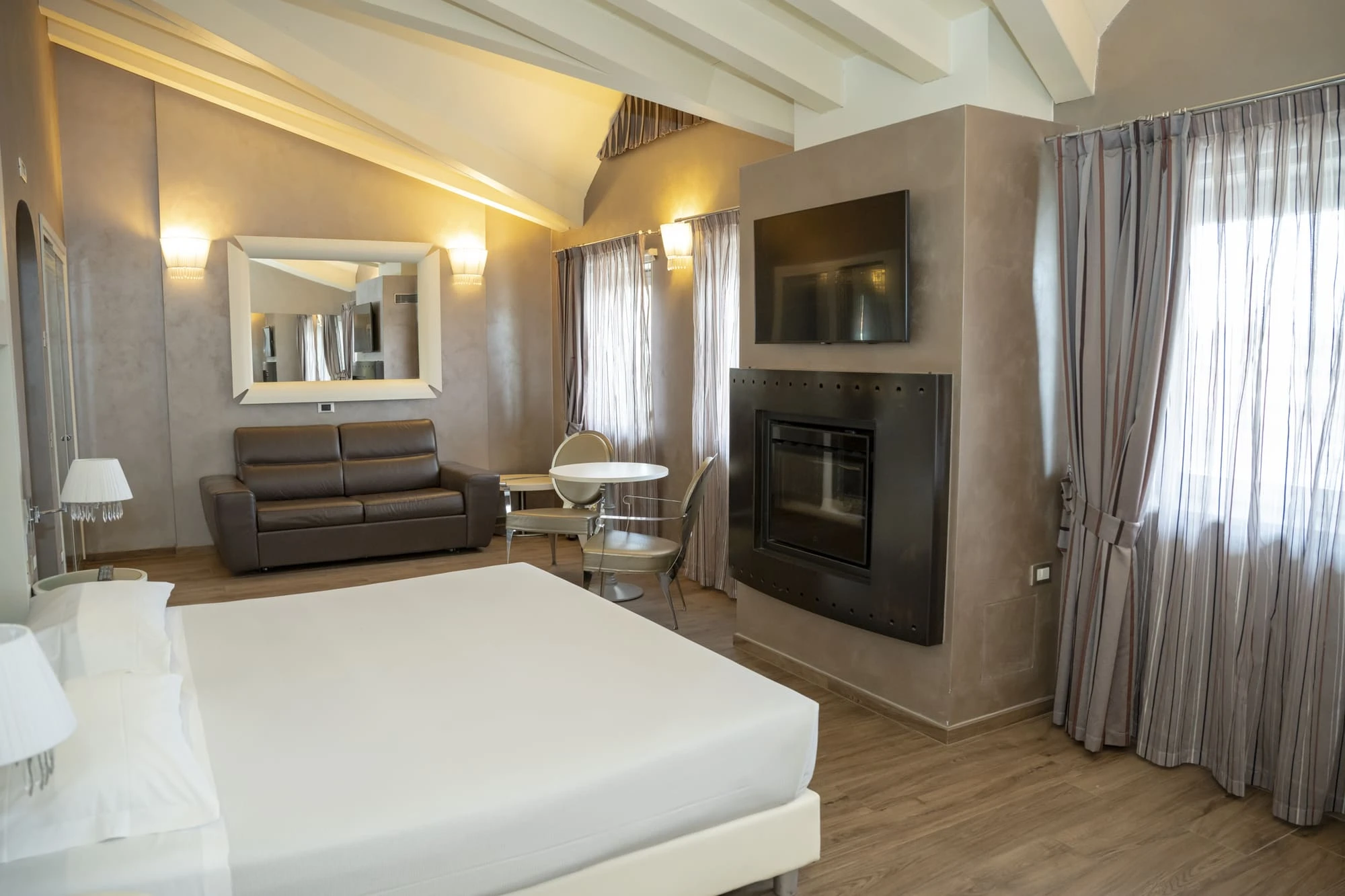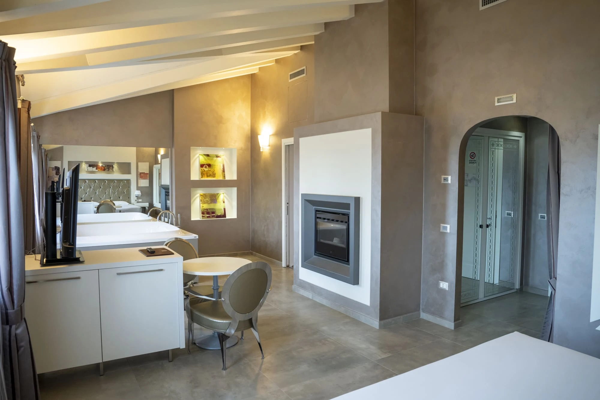 Hotel lussuoso, camere spaziose e pulite, con due letti matrimoniali e vasca idromassaggio privata. C'è anche un caminetto e una grande TV con Sky. Il personale è molto cordiale e professionale. La colazione è deliziosa e abbondante. Bevande e cibo possono essere ordinati in camera in qualsiasi momento. Un'esperienza davvero unica.