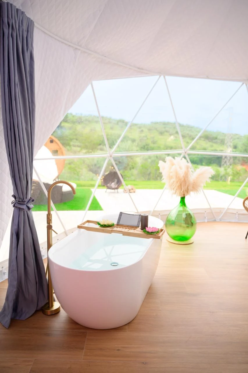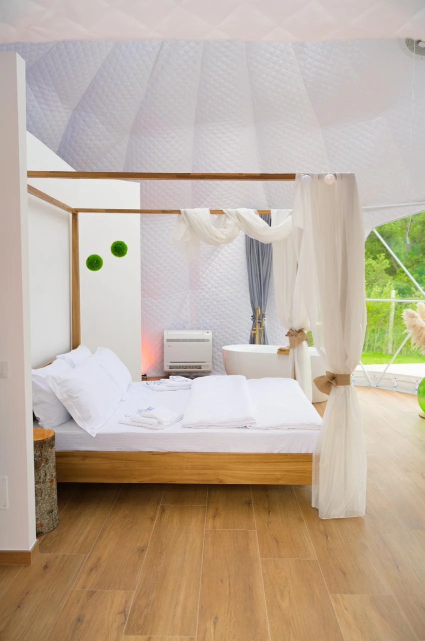 La struttura, accogliente e curata nei minimi dettagli, dispone di un letto matrimoniale king size, una vasca interna panoramica, bagno privato con doccia cromoterapica e una zona relax esterna. La caratteristica principale della cupola è la parete trasparente, che ti permetterà di ammirare il cielo stellato direttamente dal letto.