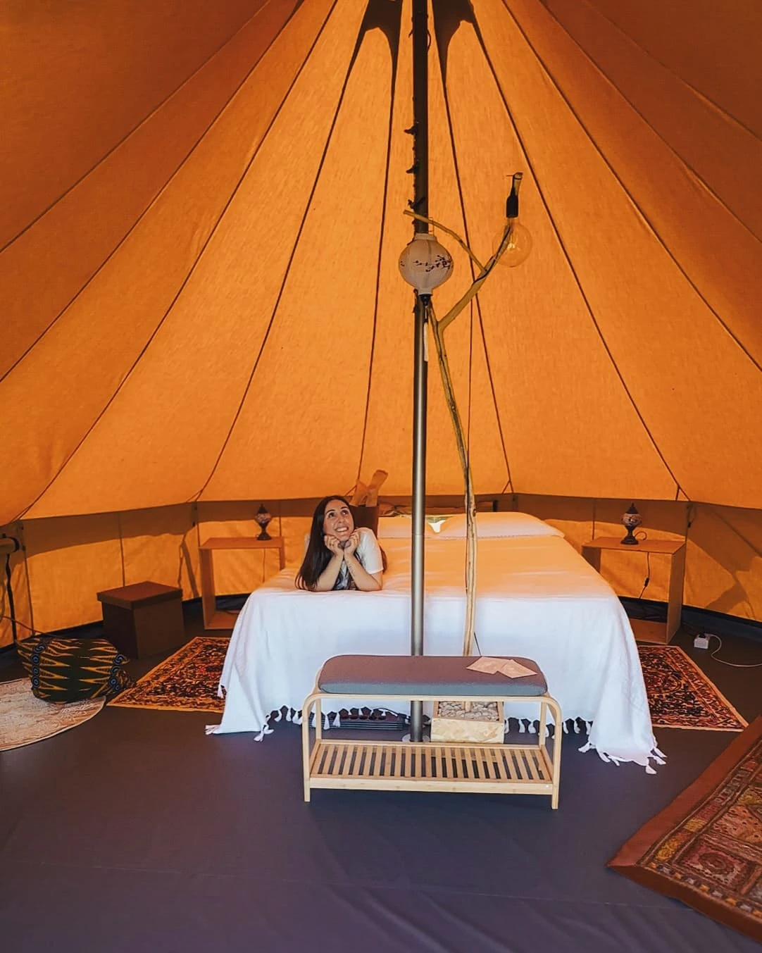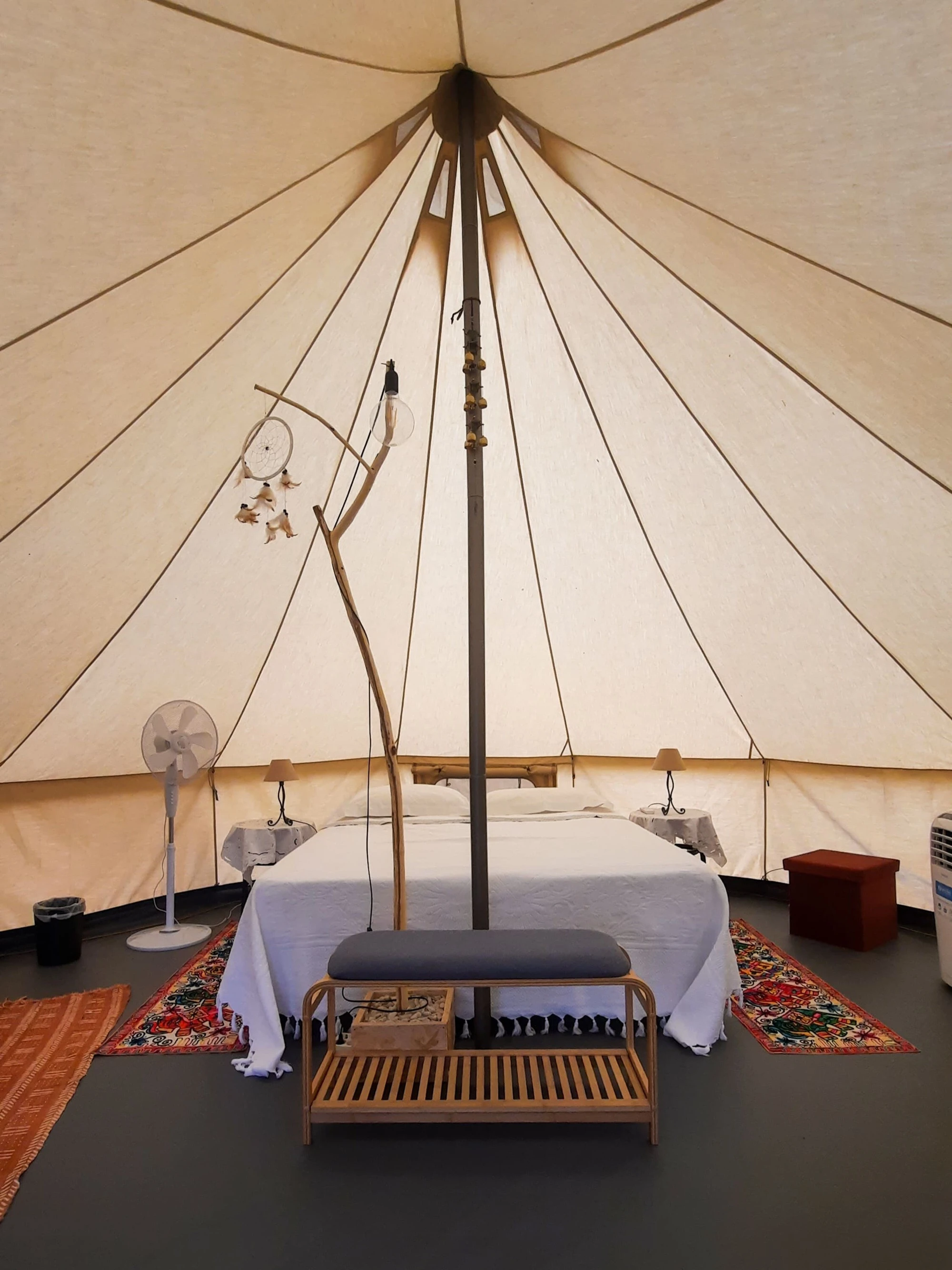 Le 2 tende glamping, arredate con oggetti provenienti da diversi continenti raccolti durante i nostri viaggi, offrono un'atmosfera calda e accogliente. Ogni tenda è dotata di un letto matrimoniale, con la possibilità di aggiungere fino a due letti singoli, per ospitare fino a quattro persone. Per garantire il massimo del comfort, le tende dispongono di ventilatore, climatizzatore, zanzariere, mobili ed elettricità.